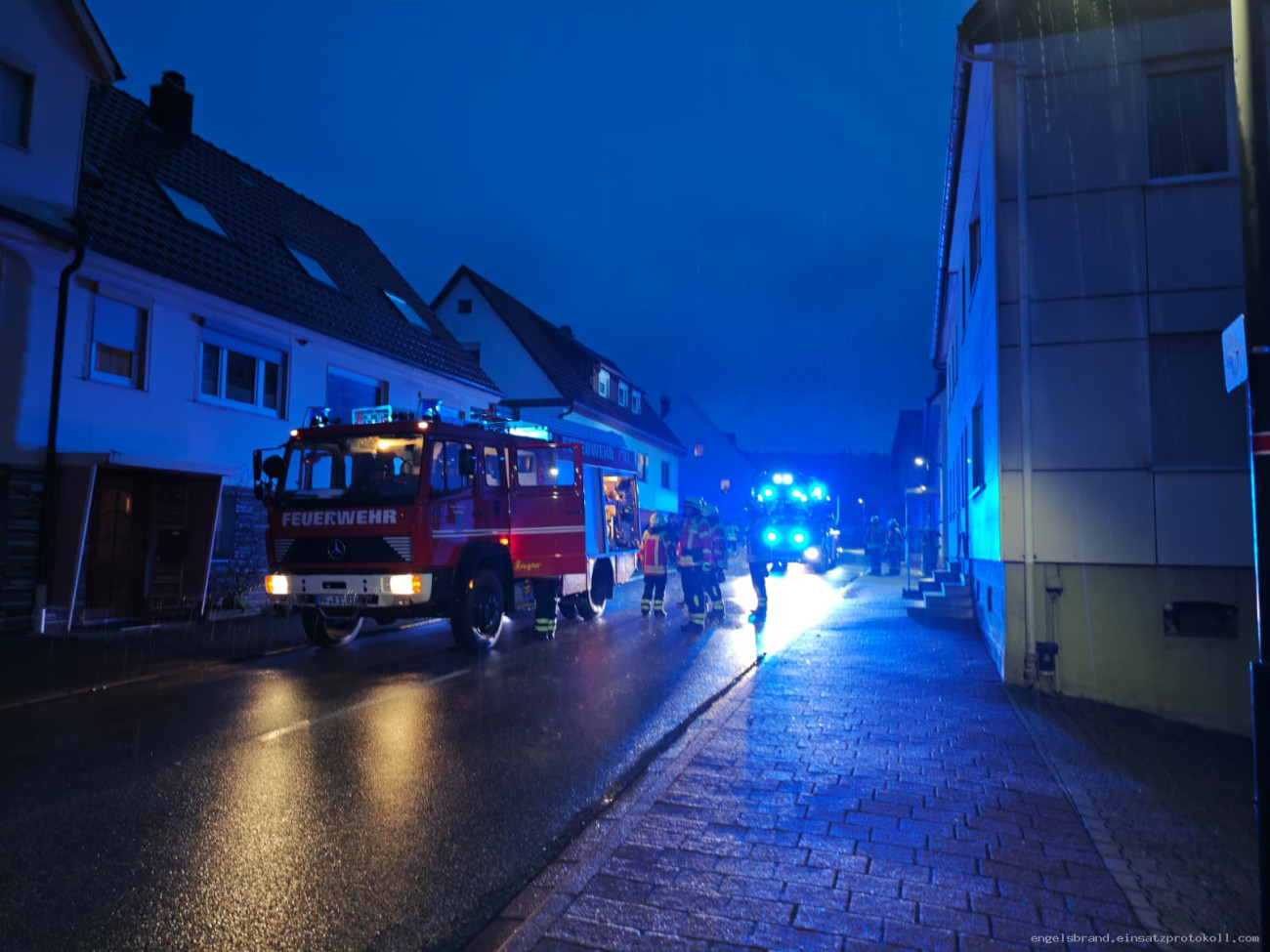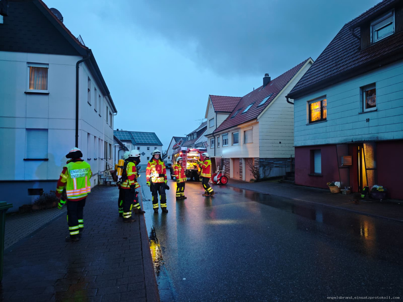 Wir wurden zu einem Kaminbrand nach Grunbach alarmiert, Alarmstufe 1, zusätzlich mit dem DLK‑Modul aus Neuenbürg.